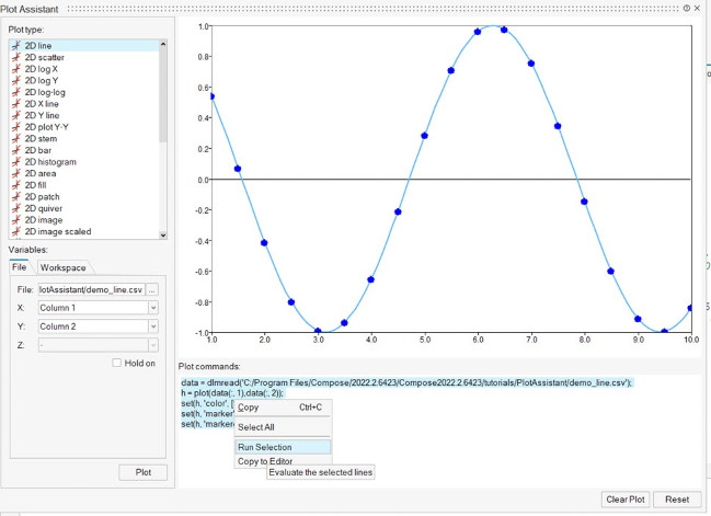 Plot Assistant’ında seçilen çizim komut satırlarına sağ tıkladığınızda, artık seçilen satırları çalıştırmak için Seçimi Çalıştır’ı veya seçilen satırları editöre kopyalamak için “Editöre Kopyala “yı seçebilirsiniz. ( Çizim Yardımcısı, Altair Compose 2022.1 versiyonunda eklenmiştir)