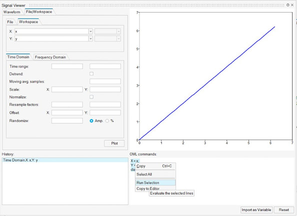 Signal Viewer’ın “File/Workspace” sekmesinde seçili OML komut satırlarına sağ tıkladığınızda, artık seçili satırları çalıştırmak için “Run Selection” veya seçili satırları editöre kopyalamak için “Copy to Editor” seçeneğini belirleyebilirsiniz.