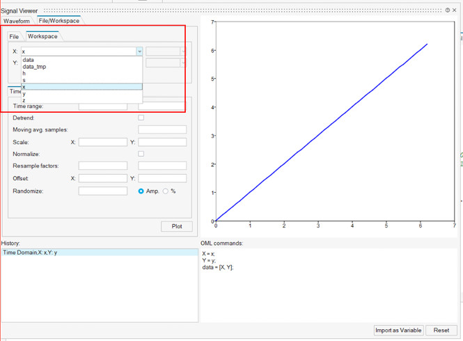 Signal Viewer’ın “File/Workspace” sekmesinde, artık değişken tarayıcıdan değişkenleri kullanabilirsiniz.