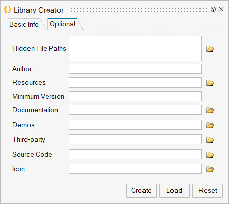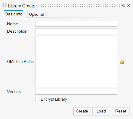Kütüphane Oluşturucu, bir Plugin.xml, loader.oml, unload.oml ve uzantı olarak kullanılan organize klasörler oluşturmak için Temel Bilgi (Basic Info) ve İsteğe Bağlı Dosyalar (Optional Files) girmek için sekmelere sahiptir.