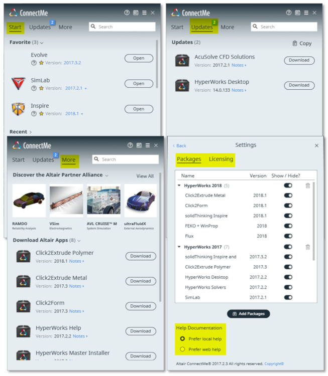 – Settings/Packages bölümünden HyperWorks yazılımlarından listelenmesini istemediklerinizi show/hide seçeneğiyle ayarlama imkanı, HyperWorks help dökümanlarına lokal veya internet üzerinden erişme ayarını gerçekleştirme imkanı