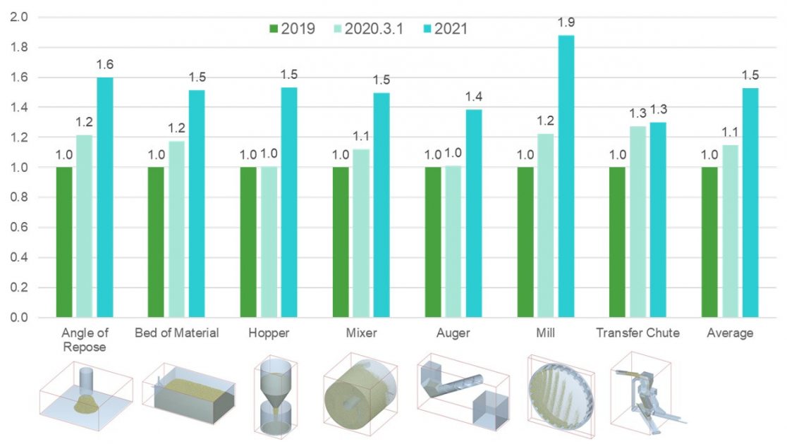 Altair EDEM çoklu küre GPU çözücü % 30’a varan bir hız artışı sağlayacak şekilde geliştirilmiştir. Aşağıdaki grafik, EDEM 2021 ve önceki sürümler arasındaki GPU hızını göstermektedir.