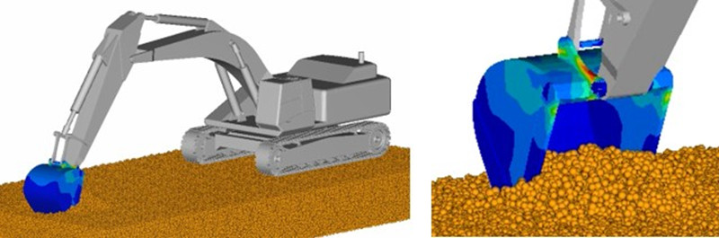 AltairEDEM’i Altair MotionSolve ile birleştirmek, ağır ekipman tasarlayan mühendislerin mekanik sistem simülasyonlarında gerçekçi dökme malzeme kullanmalarına ve makine-malzeme etkileşimi hakkında önemli bilgiler edinmelerine olanak tanır. Bu eş zamanlı simülasyonda yeni olan, component model synthesis (CMS) tabanlı esnek gövdelerin parçacıklarla etkileşime girme yeteneğidir. CMS esnek gövdeleri, doğrusal aralıktaki gövde deformasyonunu temsil edebilir. Parçacıklar ve esnek gövde arasındaki temastan kaynaklanan reaksiyon kuvvetleri simüle edilir, bu da esnek gövde içinde gerilme ve gerinimlere yol açar.