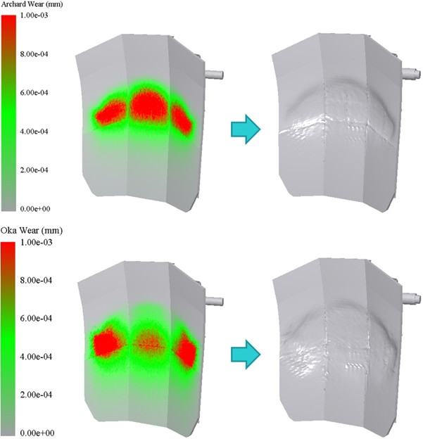 Archard ve Oka aşınma modellerinin sonuçları burada karşılaştırma amacıyla ayrı ayrı gösterilirken, modellerin birlikte abrazif ve erozyonlu aşınmaya bağlı olarak deforme olan şekli elde etmek için kullanılabileceğini belirtmekte fayda vardır.