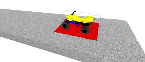 Bu örnekte, toprak benzeri bir malzeme GEMM Veritabanı kullanılarak kolayca oluşturuldu. Yatak oluşturma aracı kullanılarak, bu malzemeden hızlı bir şekilde uzun bir yatak oluşturuldu. EDEM, lastik-zemin etkileşimini gerçekçi bir şekilde simüle etmek için bir mekanik sistem simülasyonu yazılımı ile birleştirildi. Simülasyon, dinamik alan kullanılarak GPU‘da çalıştırıldı. Bu, normalde mümkün olandan daha hızlı, sadece 3 saatte hesaplanan, tamamen bağlı 1.000.000 parçacık simülasyonuyla sonuçlandı.
