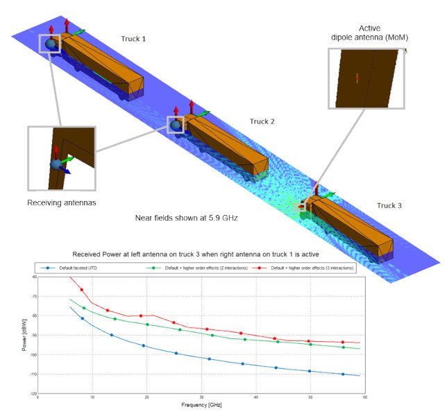 Altair Feko çözücülerinin esnekliği, modelin bazı parçalarını çözmek için çok yönlü UTD’nin kullanıldığı ve diğer parçaların MoM ile çözüldüğü hibrit simülasyonları destekleyecek şekilde genişletilmiştir. Hem tam bağlı hem de bağlantısız simülasyonlar desteklenir, ancak MoM bölgesindeki dielektrikler henüz desteklenmemektedir. Alıcı antenler de (uzak alan, yakın alan veya küresel modlar kullanılarak tanımlanır) simülasyona dahil edilebilir. Çok yönlü UTD’ye ek optik efektlerin yanı sıra daha yüksek dereceli efektler eklenerek birçok durumda daha doğru simülasyonlar elde edilir.