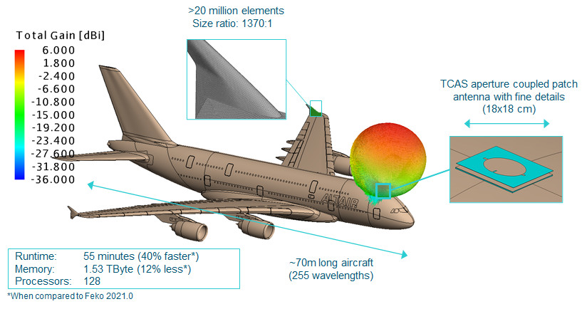 MLFMM çözümündeki paylaşılan bellek uygulamasındaki geliştirmeler ve düşük seviyeli MPI optimizasyonları, yüksek düzeyde dağıtılmış simülasyonlar (birden çok düğüm arasında) için geliştirilmiş paralel verimlilik (hem çalışma zamanı hem de bellek) ile sonuçlanır.