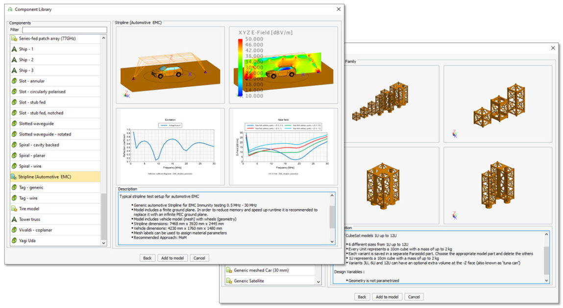 FEKO anten kütüphanesine bir dizi yeni anten ve platform ile güncellenmiştir. On yeni anten modeli (EMC testi için antenler dahil) ve dört yeni platform modeli eklendi.