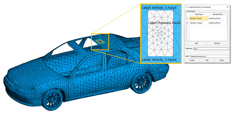 Yeni bir alan bağlantısı yaklaşımı, belirli parçaların meshlerinin MoM ve MoM/MLFMM çözümleri sırasında, meshlerin sınırlarının birbirine yakın olduğu yerlerde, bu sınırlardaki mesh köşeleri çakışmasa bile “bağlıymış” gibi işlem görmesini sağlar. Etki alanı bağlantısı artık CADFEKO (2023’te yeni) veya EDITFEKO’da (2022.3’ten beri) yapılandırılabilir ve POSTFEKO’da (2023’te yeni) görselleştirilebilir.