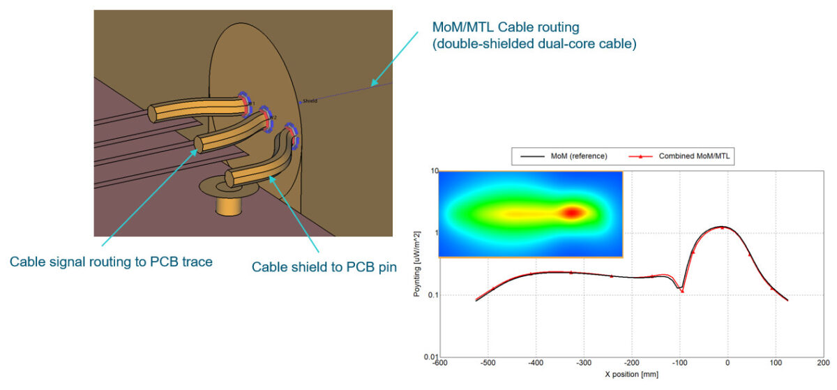 MoM/MTL’nin birleştirilmesiyle modellenen kablo sinyallerinin sonlandırma noktalarından MoM kullanılarak modellenen keyfi 3B geometriye kadar gerçekçi bağlantılar artık desteklenmektedir. Bu, kablo konnektörlerinde hem radyasyonu hem de iletimi, kusurlu koruma, pigtail’ler ve gerçek çekirdek iletken yönlendirmesi gibi etkiler dahil olmak üzere doğru bir şekilde modellemeyi mümkün kılıyor.