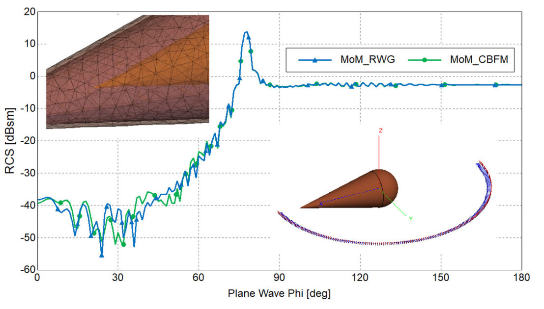 Kayıplı bir dielektrik malzeme ile kaplanmış bir koni-küre için CBFM kullanarak RCS hesaplaması. Bu yaklaşım kullanılarak bellek ve çalışma süresi gereksinimlerinde büyük azalmalar elde edilebilir (MoM ile karşılaştırıldığında aşağıdaki örnek için yaklaşık 13 kat daha az zaman ve bellek gerekir).