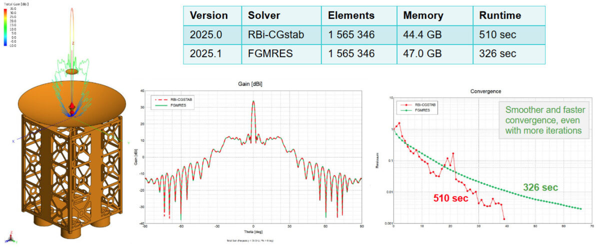 MLFMM, hibrit FEM/MoM, hibrit FEM/MLFMM ve sadece FEM tabanlı simülasyonlar için yeni bir iteratif çözücü (FGMRES) eklenmiştir. Bu çözücü, daha hızlı yakınsama oranı ve daha kararlı çözümler sunuyor.
