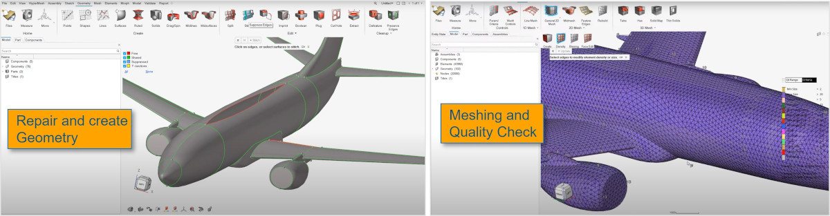 HyperMesh, orta yüzey çıkarma (mid-surface), midmesh ve tetra meshleme gibi yüzey ve katı meshleme için gelişmiş araçlar ve iş akışları ile karmaşık geometrilerin meshlenmesi için güçlü araçlara sahiptir. Bu iş akışlarının bir demosunu Video 6‘da bulabilirsiniz. Bu video ayrıca mesh kalitesi değerlendirmesini kapsamakta ve gelişmiş mesh düzenleme işlevselliğini göstermektedir.