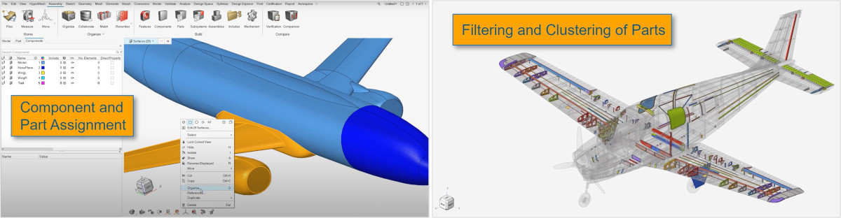 İçe aktarılan CAD verileri nadiren temizdir. HyperMesh, elektromanyetik analize hazırlık olarak CAD yapılarını onarmak ve temizlemek için güçlü özellikler sunar. Örneğin, bir yapıyı elektromanyetik saçılma analizi için hazırlamak için, metalik parçaların bağlantısı simülasyon modelinde doğru şekilde yakalanmalıdır. Bu bağlantı doğru şekilde modellenmezse, nesne üzerinde hesaplanan akım dağılımı gerçek akım dağılımını temsil etmeyecektir (rezonanslar gözden kaçabilir veya ekstra rezonanslar eklenebilir), bu da saçılma analizi sonucu üzerinde büyük bir etkiye neden olur. Yüzeyler arasındaki bağlantılar HyperMesh’te kolayca yapılandırılabilir ve görselleştirilebilir (farklı renkler kullanılarak).
