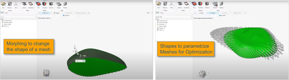 Karmaşık bir yapının şeklindeki değişiklikleri göz önünde bulundurmak için HyperMesh’teki morphing teknolojisi çok güçlüdür. Video 7‘de detayları bulabilirsiniz. Bu tür deformasyonlar HyperMesh’te Şekiller (shapes) olarak kaydedilebilir. Şekiller, deformasyonun genliğini tanımlayan tasarım değişkenleri ile ilişkilendirildiğinden, bu yaklaşım kullanılarak şekil optimizasyonu mümkündür.