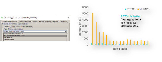 Şimdiye kadar, kullanıcılar paralel çözüm için sadece direct çözücü olan MUMPS kullanabiliyordu. Küçük modellerde çok etkili olan bu çözücünün büyük 3D simülasyonlara uygulanmasında çok fazla bellek (RAM) gerekmekteydi. Bu durumlar için Altair Flux artık daha az bellek gereksinimi ihtiyacı duyulan ve bazı çalışmalarda çözüm süresini kısaltan PETSc kütüphanesinden gelen paralel yinelemeli bir çözücü sunmaktadır.