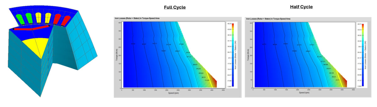 Parametrik dağılımın daha iyi yönetilmesi de önemli zaman kazanımları sağlamıştır. Bir kullanıcı modelinde 40.000’den fazla zaman adımı ile zaman yarı yarıya azaltılmıştır. Elektrik kesmelerinin oluşturulması veya fizik tanımının otomatik kontrolü gibi diğer algoritmalar da optimize edilmiştir. Flux Electric Machine Toolbox’ta (FeMT), demir kayıplarının hesaplanması artık sadece yarım periyotluk sinyaller kullanılarak yapılabilir, bu da çoğu durumda hesaplama sürelerini neredeyse yarıya düşürür ve nihai sonuçlar için aynı kalitede olur.