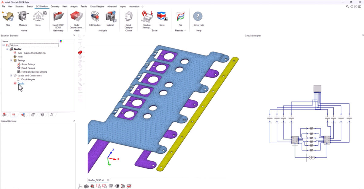 Güç baraları ile ilgilenmeniz gerektiğinde Altair SimLab, baralardaki girdap akımlarının herhangi bir hava meshi olmadan hesaplanmasını sağlayacak PEEC yöntemine dayalı özel bir modül de içerir. Baraya bağlanan harici elektrik devresi aynı arayüz içinde kolayca tanımlanabilir ve baralardaki joule kayıpları çeşitli frekanslar için çok hızlı ve hassas bir şekilde hesaplanabilir.