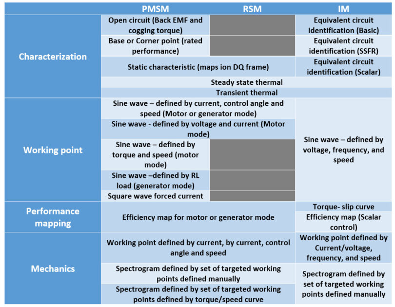 FluxMotor, her motor tipi için önceden tanımlanmış bir test listesi ile birlikte gelir. Karakterizasyon, çalışma noktası, performans haritalama (verimlilik haritası) ve mekanik (NVH) testlerini içerir. Aşağıdaki tablo FluxMotor 2022.3’teki mevcut testlerin bir özetini göstermektedir. Termal ve NVH testlerinin şu anda yalnızca iç rotor için mevcut olduğunu unutmayın.