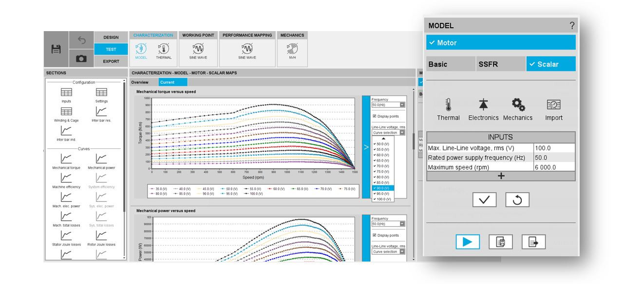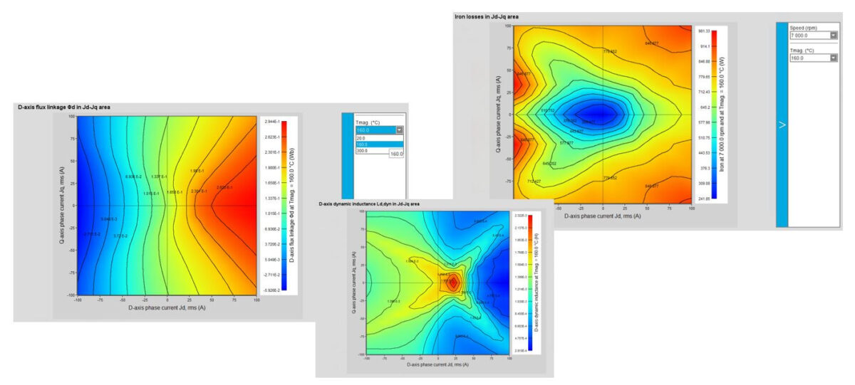Bu sayede, elde edilen veriler Altair Activate veya Altair PSIM gibi sistem simülasyon yazılımlarında kullanılmak üzere hazır hale gelir. Gerçekten de, bu testte elde edilen sonuçlardan bir skaler sürücü ve kontrol uygulanabilir. Bu hesaplamalar, çapraz doygunluk ve girdap akımı etkilerini dikkate alan doğrusal olmayan bir modelin tanımlanmasına ve çözülmesine dayanmaktadır. Tüm temel elektromanyetik büyüklükler, belirli bir güç kaynağı frekansı ve bir dizi Hat-Hat gerilimi için hızın fonksiyonu olarak eğriler olarak hesaplanır ve eğriler halinde görüntülenir.