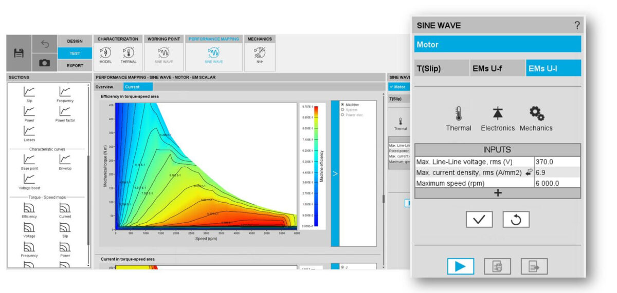 Altair® FluxMotor®‘un son versiyonu ile asenkron makineler için verimlilik haritaları sağlanmış ve skaler kontrol komutu dikkate alınarak “Tork-Hız” alanında sincap kafesli indüksiyon makinelerinin davranışının karakterize edilmesine izin verilmiştir. 2023 ile yeni giriş parametreleri kullanılabilir: maksimum hat akımı ve makinenin maksimum hızı ile birlikte maksimum Hat-Hat voltajı. Bu yeni seçenekle, temel hız noktasının hızı (Nominel güç besleme frekansı) artık kullanıcı girişi ile belirlenmez; bunun yerine mekanik gücü maksimize etmek için içsel hesaplama süreciyle çıkarılır.
