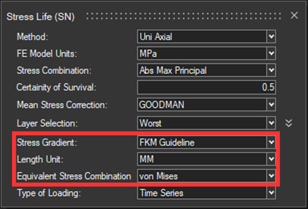 Gerilim gradyanları düzeltmesi SN/EN – Tek Eksenli ve Çok Eksenli yüklemelerde Time Series yöntemi kullanılan senaryolar için desteklenmektedir. Kaynak, Transient, FOS ve Titreşim Yorulma analizleri henüz desteklenmemektedir.