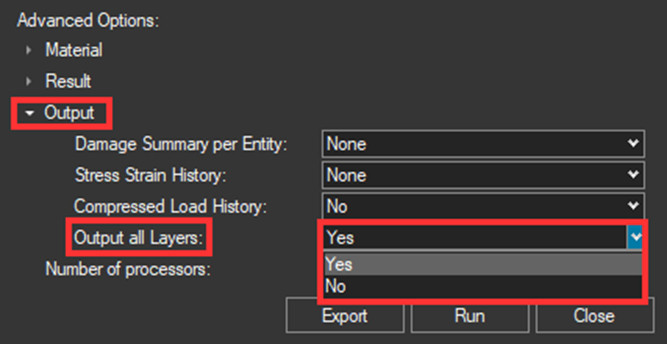 Hasar ve Ömür çıktısı, shell modeldeki top ve bottom katmanlar için istenebilmektedir. Bu seçim, Evaluate tool > Advance Options > Output > Output All Layers yolu izlenerek etkinleştirebilir.