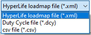 Duty Cycle dosyası (.dcy), HyperLife Load Map dosyası (.xml) ve Event mapper dosyası (*.csv) için mevcut olan import ve export seçeneklerinin tümü, Loadmap aracında ortak bir konuma taşınmıştır.