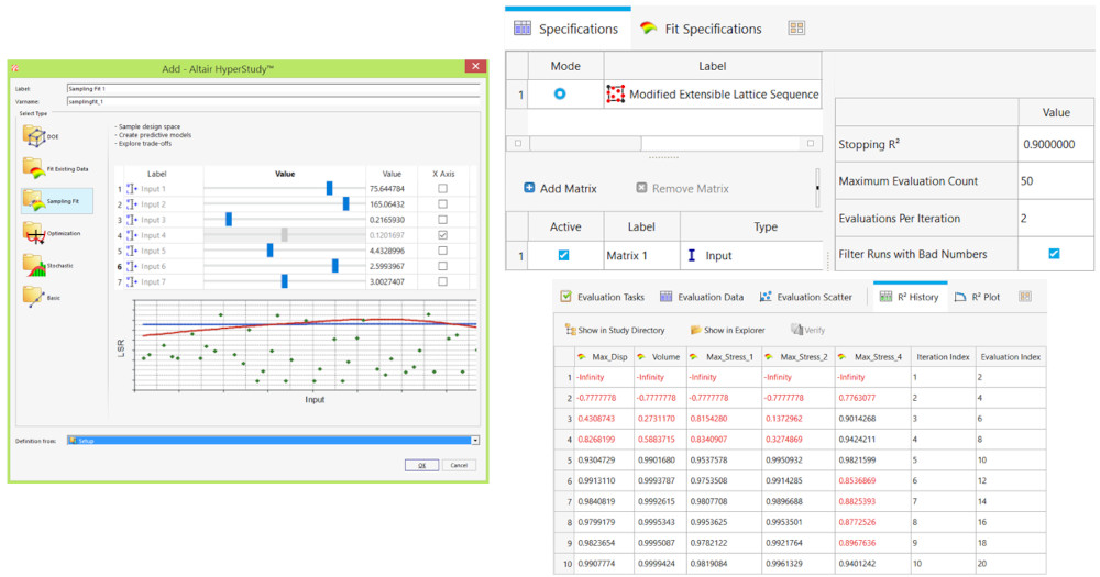 Yeni bir yaklaşım olan Sampling Fit; kullanıcıların en iyi Fit modelini elde edebilmesini sağlamak amacıyla, DoE çalışması ile birleştirilerek DoE ve Fit işlemlerinin tek bir adımda gerçekleştirilebilmesine imkan tanımaktadır. Space Filling DoE ve Fit Automatically Selected by Training (FAST) yöntemlerinin birleştirilmesi sonucunda kullanıma sunulan bu özellik, HyperStudy yazılımının tasarım uzayını otomatik bir şekilde örneklemesini ve istenen kalitede Fit modelini elde edene kadar çözüm gerçekleştirmesini sağlamaktadır.