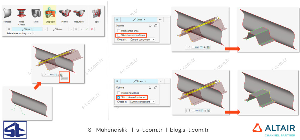 Çizgi ve node ları yüzeylere sürükleme işlemine Auto Trim seçeneği eklenmiştir. Yüzey, başka bir yüzeyin veya elemanların kesişme noktasında kırpılır.