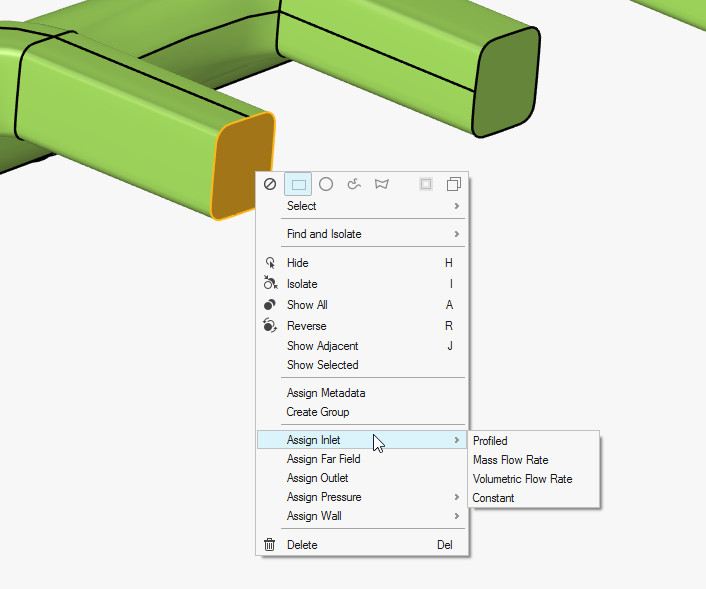 Örnek olarak aşağıdaki ekran görüntüsünde gösterildiği şekilde , tanımlama yapacağınız yüzeye sağ tıklayarak Assign Inlet > Profiled seçimiyle kolay bir şekilde giriş sınır şartı (Inlet Boundary condition) oluşturup uygun parametrelerini tanımlayabilirsiniz.