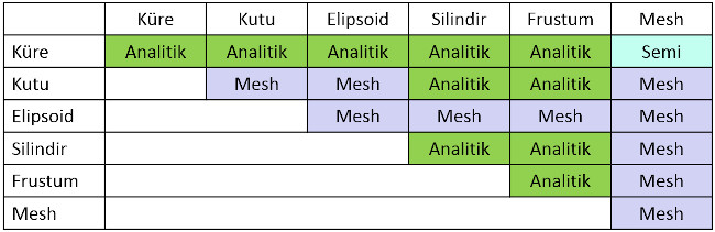 Geometriler arasındaki analitik veya mesh oluşturma durumu aşağıdaki tabloda yer almaktadır.