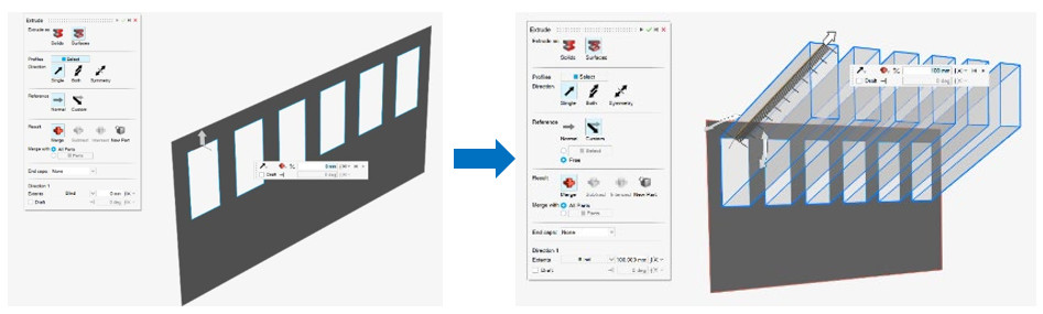 Ekstrüzyon aracı 2022 versiyonunda geliştirildi. Artık katı veya 3D yüzeyler oluşturmak için her tür profili ve 2D yüzeyleri bir veya iki yönde ekstrüde edebilirsiniz. Ek olarak, artık (1) ekstrüt edilmiş şekli hizalamak istediğiniz bir referans geometri seçerek veya (2) kavisli oku sürükleyerek veya mikro diyaloğa bir açı girerek ekstrüt edilmiş şekli serbestçe yönlendirerek özel bir yönde ekstrüzyon yapabilirsiniz.