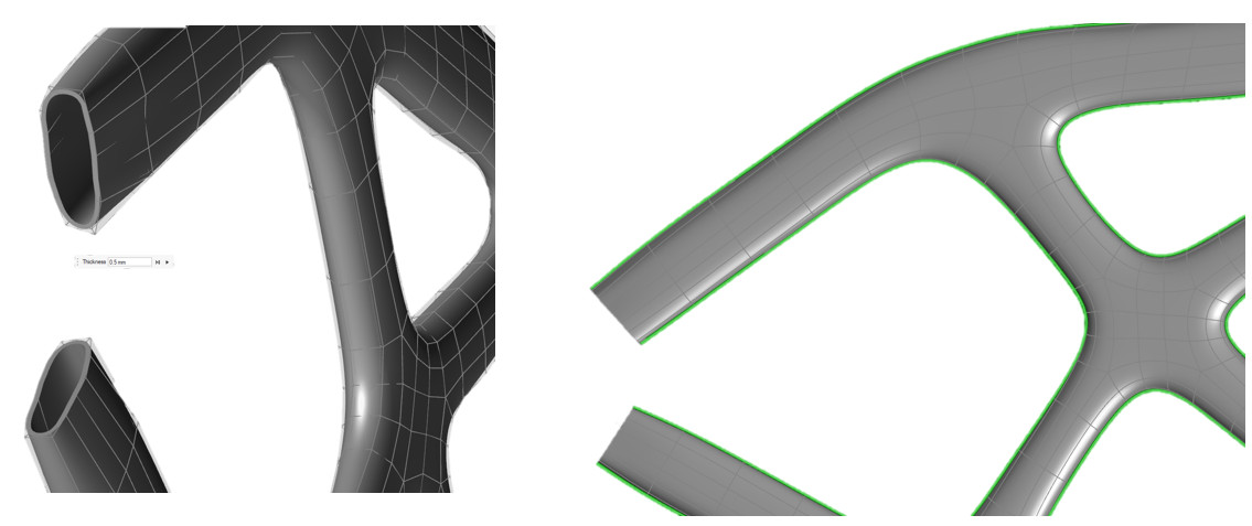 PolyNURBS şeridindeki yeni Shell aracı, kabuklu bir PolyNURBS parçası oluşturmak için kafes yüzeyini çıkarmanıza ve ince duvarlar oluşturmanıza olanak tanır.