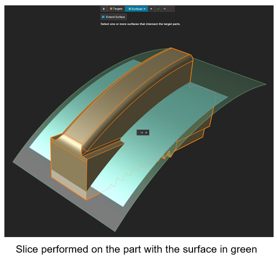 Dilimleme (slice) aracı, bir katıyı yüzeyle kesme yeteneği eklenerek geliştirildi. Hedefi tamamen kesmek için araç yüzeyi varsayılan olarak otomatik olarak genişletilir.