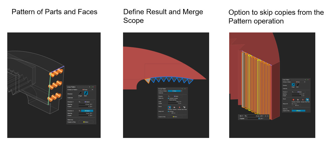 Desen (pattern) aracı geliştirildi ve artık sonuçlar üzerinde Boolean işlemleri gerçekleştirmenize ve tüm veya seçilen parçalarla birleştirmenize izin veriyor. Ek olarak, yeni “Copies“dan “Skip” seçeneğini, kalıptan çıkarılacak kopyaları seçmenize olanak tanır. Doğrusal desenler için “Seed Only” onay kutusunun seçilmesi, deseni ilk satır ve sütunla sınırlayacaktır.
