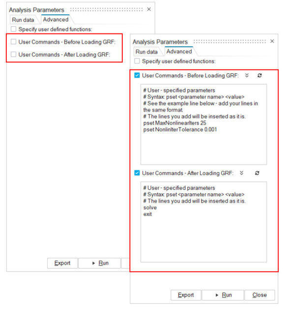 Inspire Extrude arayüzü (GUI), yaygın olarak kullanılan tüm proses parametrelerini destekler. Ancak çözücü, diğer birçok gelişmiş parametre ve komuta sahiptir. Bazı kullanıcıların özel koşullar altında bu komutları/parametreleri kullanması gerekebilir. Bu versiyonda, bunu duruma göre değil genel olarak desteklemek için yeni bir mekanizma geliştirilmiştir. Kullanıcılar artık bu komutları belirleyebilir ve değişkenleri Run panelinin Advanced sekmesinde ayarlayabilir.