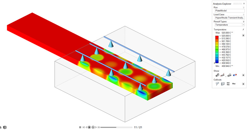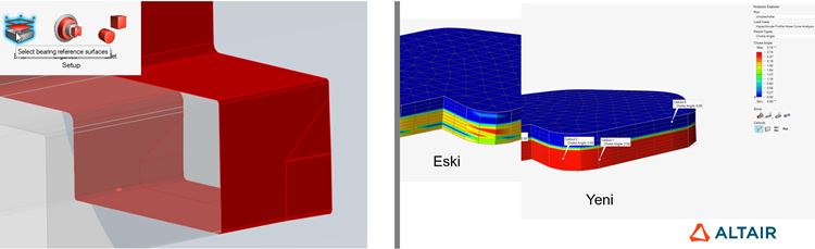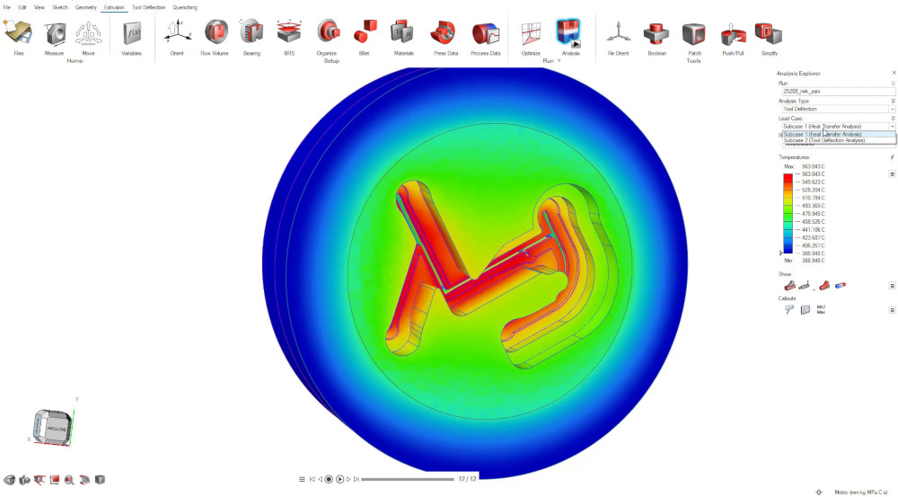 Inspire Extrude Metal yazılımında, doğru profil çıkışını elde etmek için birleşik çözüm gerçekleştirebilir. Bu çözümde akış analizi yapılırken yükler, kalıp deformasyonu analizi için arka planda entegre yapısal çözücüye (Altair OptiStruct) aktarılır. Akış çözücüsü deformasyonu okur ve ekstrüzyon analizine devam eder. Bu süreç tamamen otomatiktir. Inspire Extrude 2022 versiyonuna, birleşik ekstrüzyon ve kalıp ısı transferi analizi eklenmiştir. Birleşik çözüm, gerilme analizini gerçekleştirmeden önce bir ısı transferi adımı gerçekleştirmek için geliştirilmiştir. Bu yeni özellik, gerilme analizi çözümünün doğruluğunu artıracaktır.
