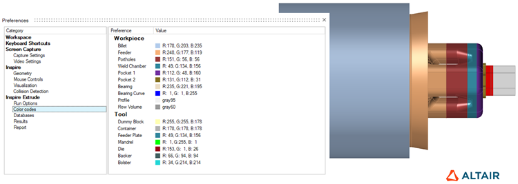 Kütük, kalıp vb. gibi farklı metal ekstrüzyon parçaları için kullanılan renkler artık Preferences bölümünden kontrol edilebilir. Parçalar için standartlaştırılmış bir renk şeması kullanmak, kolay tanımlama sağlar ve şirket içinde bir standart uygular.