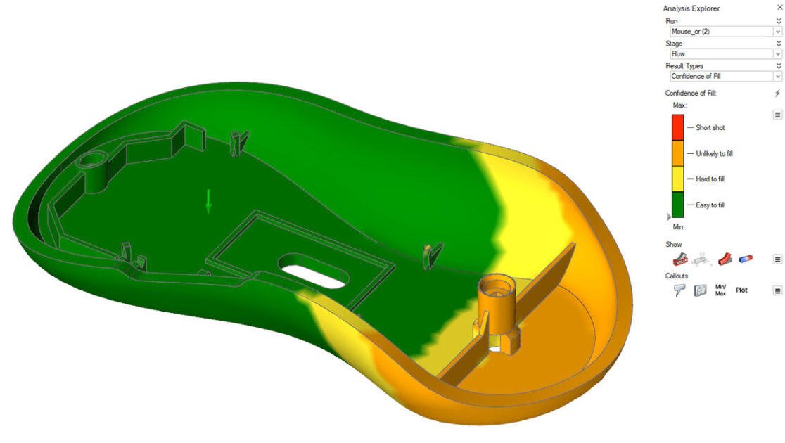 Confidence of Fill : Belirtilen enjeksiyon parametreleri altında polimer malzemenin boşluk içindeki dolum kapasitesini göstermektedir. Sonuçlar dört farklı aşamada kategorize edilmiştir: Yeşil alanlar güvenlidir. Sarı ve turuncu alanlar giderek daha riskli hale gelmektedir. Kırmızı alanlar mevcut ayarlar altında doldurulmayacaktır.