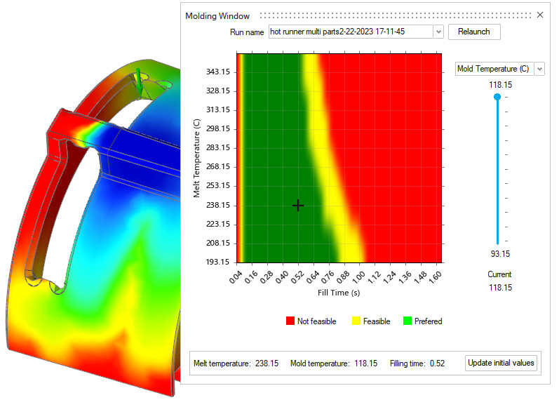Bir kalıplama penceresi analizi çalıştırdığınızda, artık grafiğin istediğiniz bölgesine tıklayabilirsiniz ve Inspire Mold otomatik olarak tüm simülasyon için seçilen ayarları kullanacaktır.