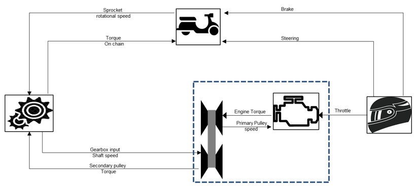 Altair MotionView’daki İki Tekerlekli Araç Kütüphanesi, Scooter modelleri için bir CVT (Sürekli Değişken Şanzıman) Güç Aktarma Organları içerir. Altair CVT Güç Aktarma Organları, Kontrol Durumu Denklemleri (CSE) şeklinde CVT’li bir otomobil IC motor güç aktarma organını temsil eden matematiksel bir formülasyondur.
