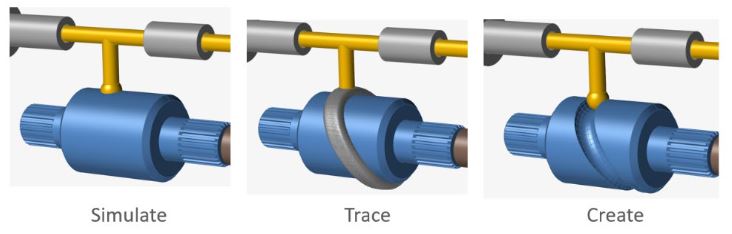 Bir parçanın yolunu bir hareket zaman aralığı boyunca izleyebilirsiniz. İzi katı parçaya dönüştürebilir ve iz parçası ile diğer parçalar arasında geometri işlemleri ( birleştirme, çıkartma, kesişim vb.) gerçekleştirebilirsiniz. Yolu hareketli bir referans çerçevesi üzerinde çizmeyi seçerek parçanın hareketinden şekiller (kamlar gibi) sentezleyebilirsiniz.