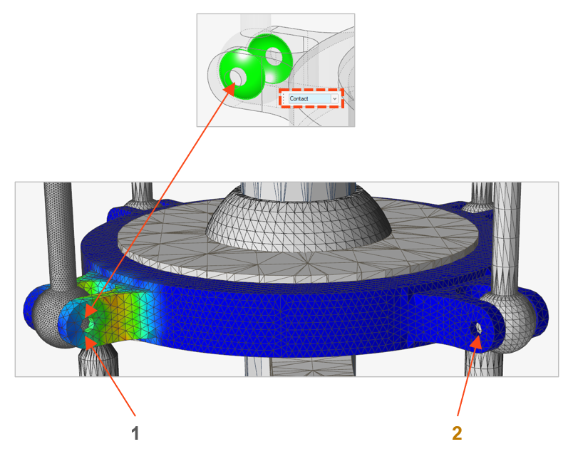 Altair MotionSolve iki parça arasındaki 2D veya 3D temas (contact) kuvvetini destekler. Önceki sürümlerde, Altair MotionSolve yalnızca rijit parçalar için teması destekliyordu. 2022.1 versiyonuyla birlikte, temas CMS tabanlı esnek parçaları da kapsayacak şekilde genişletilmiştir. Bir esnek gövde ile başka bir rijit/esnek gövde arasındaki teması tanımlayabilirsiniz. Mafsal bölgeleri de dahil olmak üzere temas nedeniyle doğru deformasyon ve gerilmeyi elde edebilirsiniz.