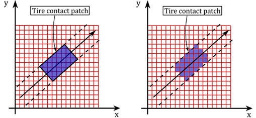 RBF yönteminde, lastik temas alanı içerisindeki yaylar toplanır ve zemin yükseklik değerleri, Şekil 2’de gösterildiği gibi, mevcut lastik-arazi etkileşimini uygun bir şekilde tanımlayan eşdeğer bir düzlem oluşturmak için kullanılır.