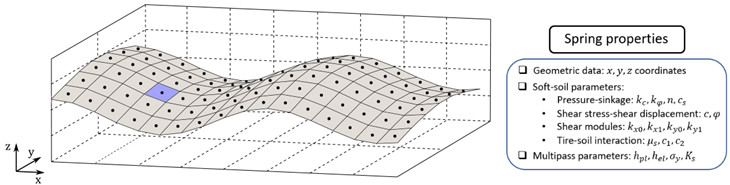 Zemin modeli, Bekker, Wong, Janosi, Hanamoto tarafından ortaya konan klasik ve köklü ilkelere ve mekanik sistem simülasyonu çözücülerinin mevcut yeteneklerine dayanmaktadır. Yol, Şekil 1’de gösterildiği gibi dikey yönde deforme olabilen yaylardan oluşan dikdörtgen yapılı bir ızgara olarak modellenmiştir. Bu yaklaşım, hızlı yürütme, büyük yol senaryolarını ele alma ve çoklu geçiş etkisi ile palet-lastik birleşik yolu gibi zorlukları ele alma yeteneği sağlar.