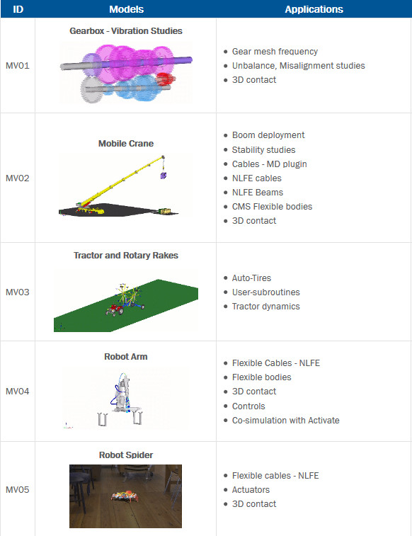 ALTAIR mekanik sistem simülasyonu model kütüphanesi, ALTAIR MotionSolve yeteneklerinin birçok farklı sektörde uygulama örneklerini göstermektedir.