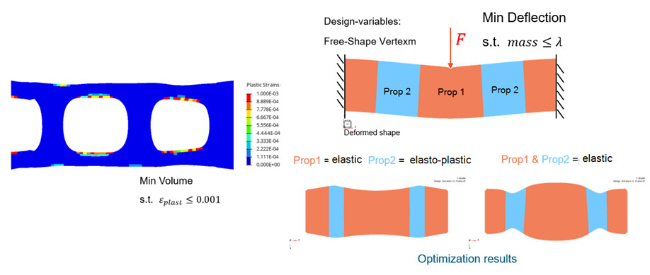 Elasto-plastisiteyi dikkate alan şekil optimizasyonu artık mümkündür. Plastik gerilmeler, Deplasmanlar, Kütle ve Hacim yanıt olarak kullanılabilir. Şekil optimizasyonu (DVGRID) ve Free-shape (Serbest şekil) (DSHAPE) optimizasyonu desteklenmektedir. Serbest şekil için hem Klasik hem de VERTEXM yöntemleri mevcuttur.