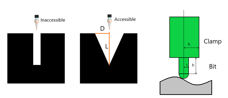 Frezeleme kısıtlamaları iki yoldan biriyle tanımlanabilir: DTPL’deki AÇI (D/L oranı) alanını doğrudan tanımlayarak veya DTPL’deki R, B ve H alanlarını kullanarak freze ucunun ve kafasının boyutlarını tanımlayarak.