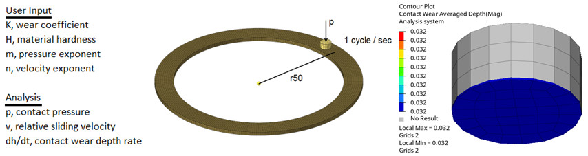 Aşınma, Archard Aşınma denklemine göre hesaplanır ve aşınma katsayısı, sertlik ve üsler gibi parametreleri tanımlayabilirsiniz. Ortaya çıkan sonuçlar temas basıncını, kayma hızını ve aşınma derinliğini gösterecektir.